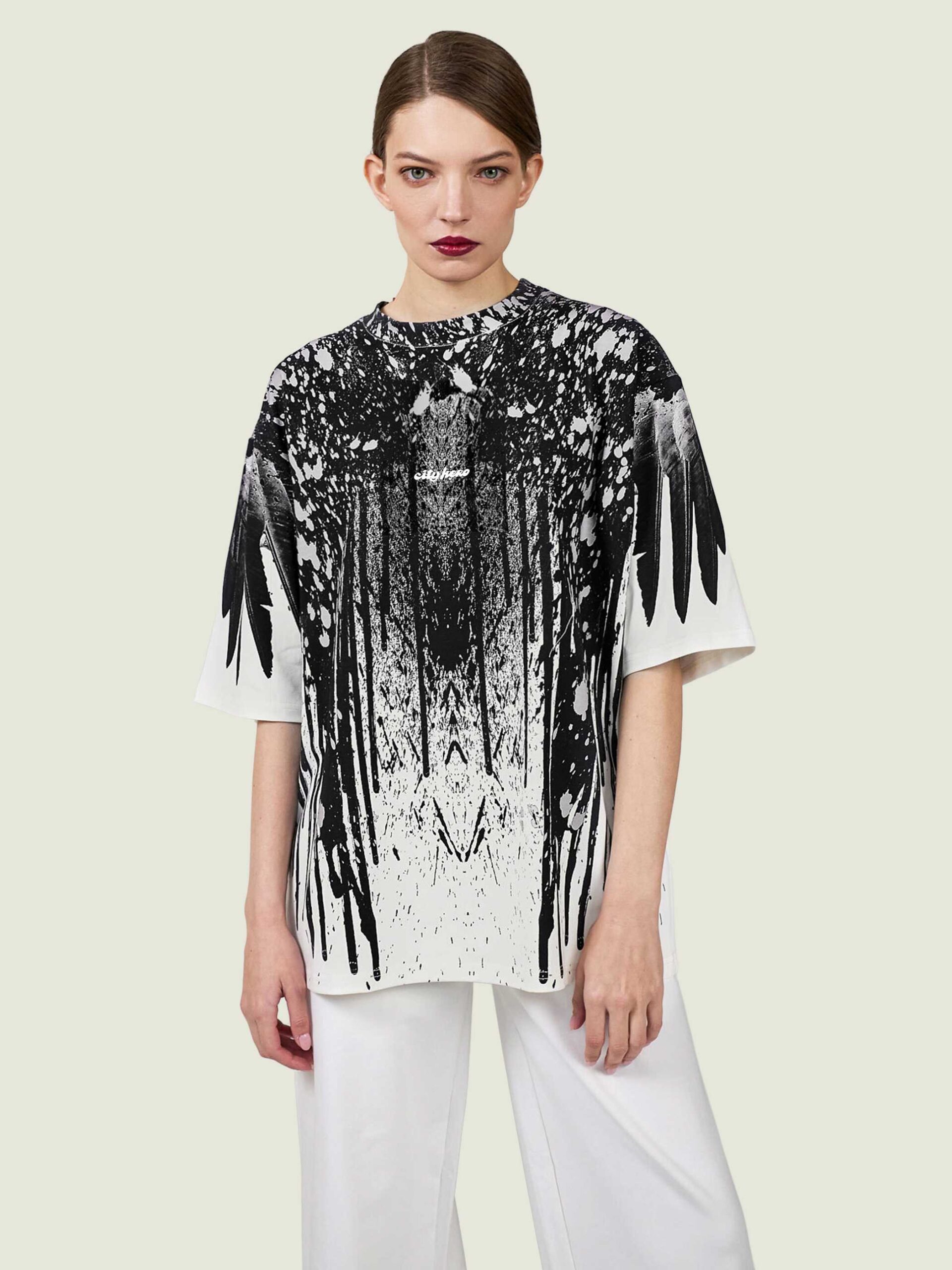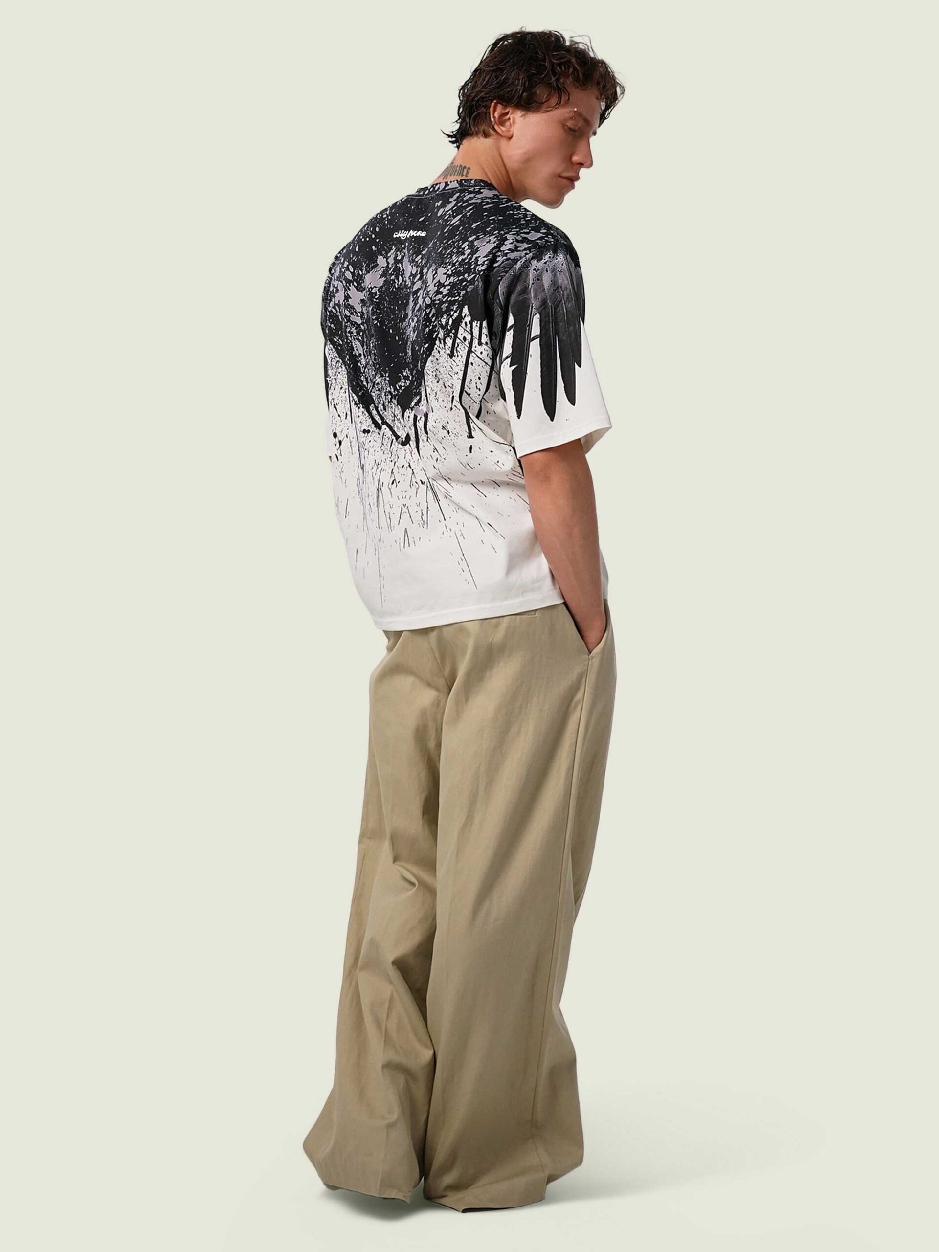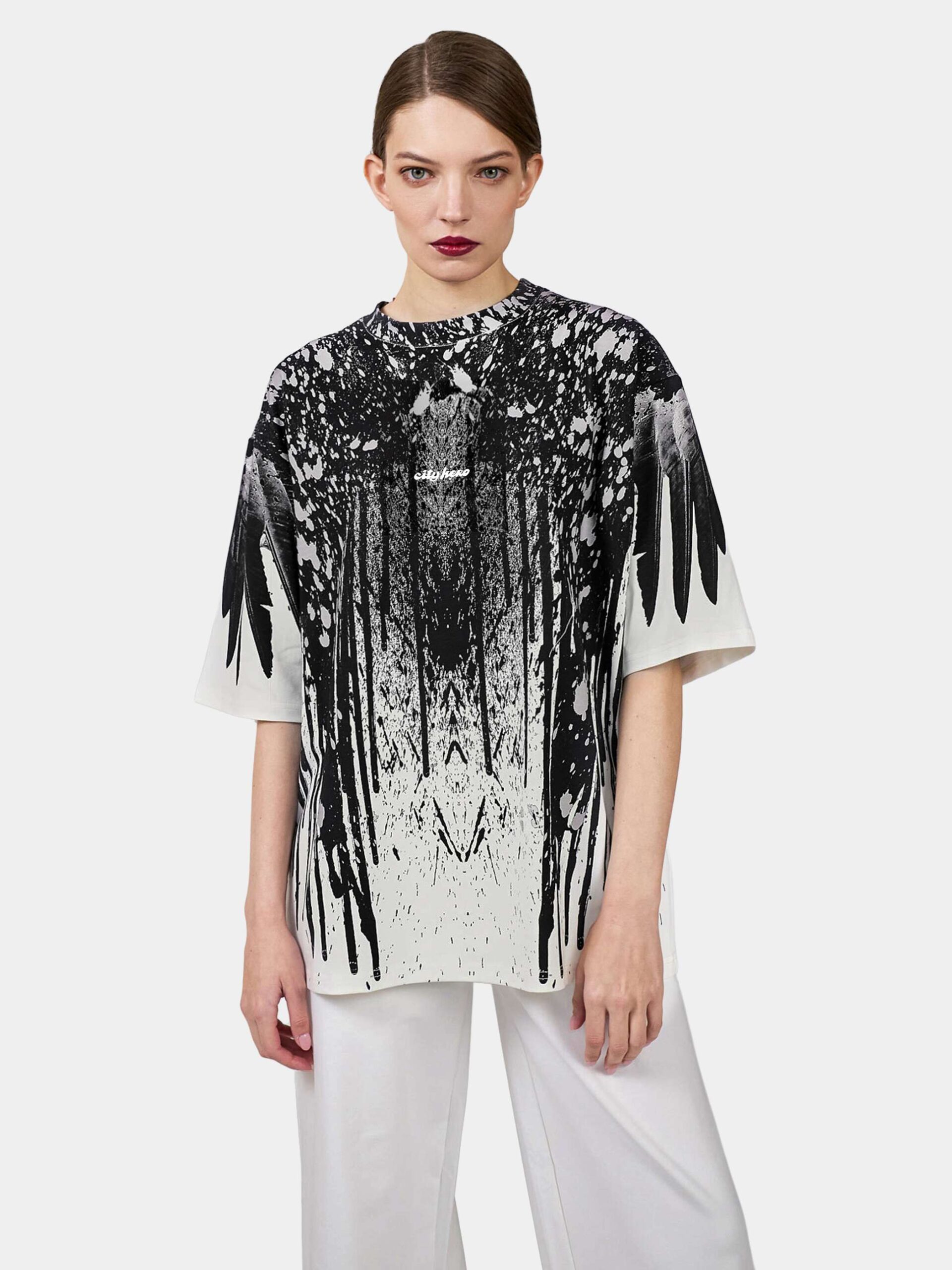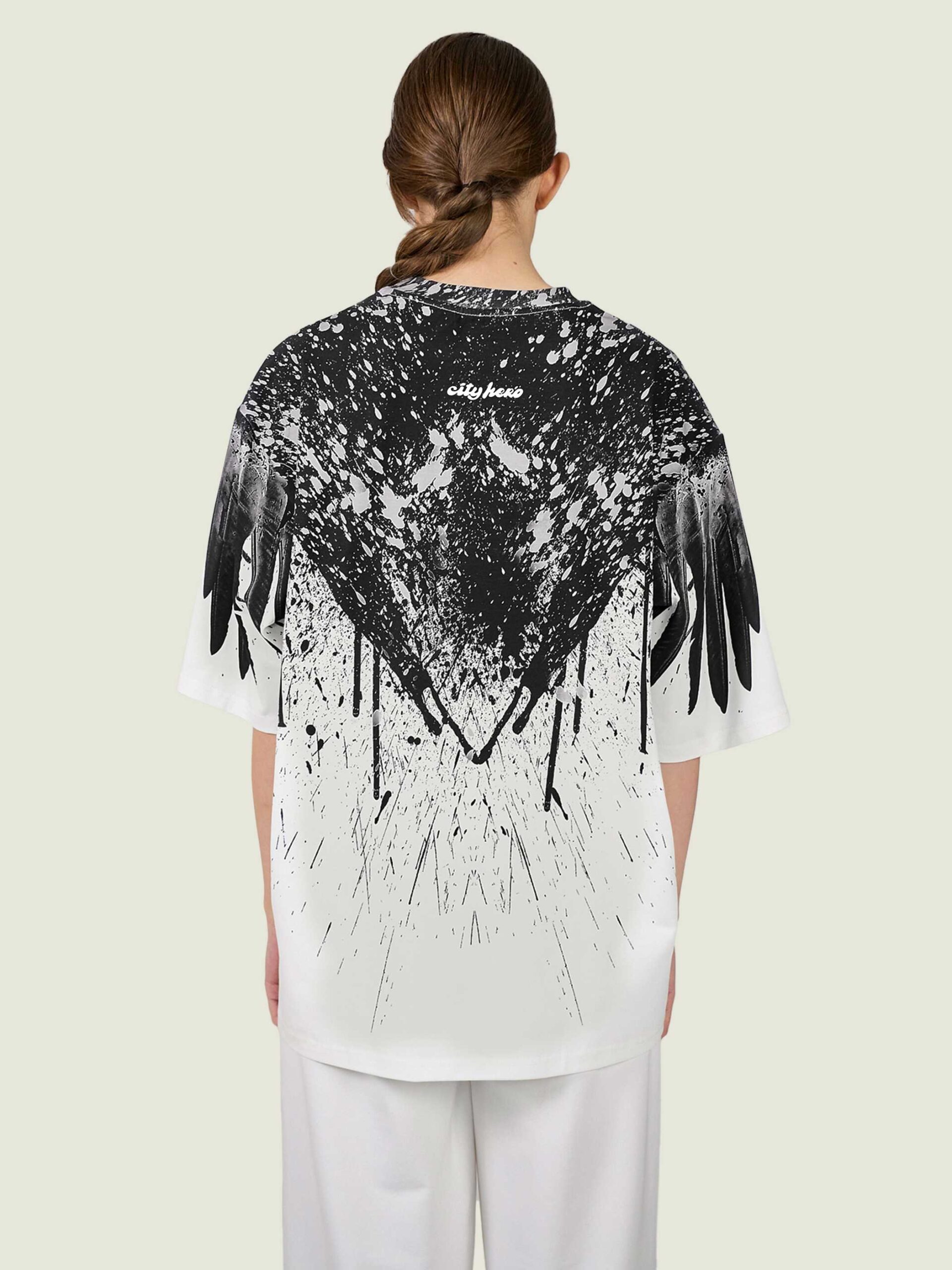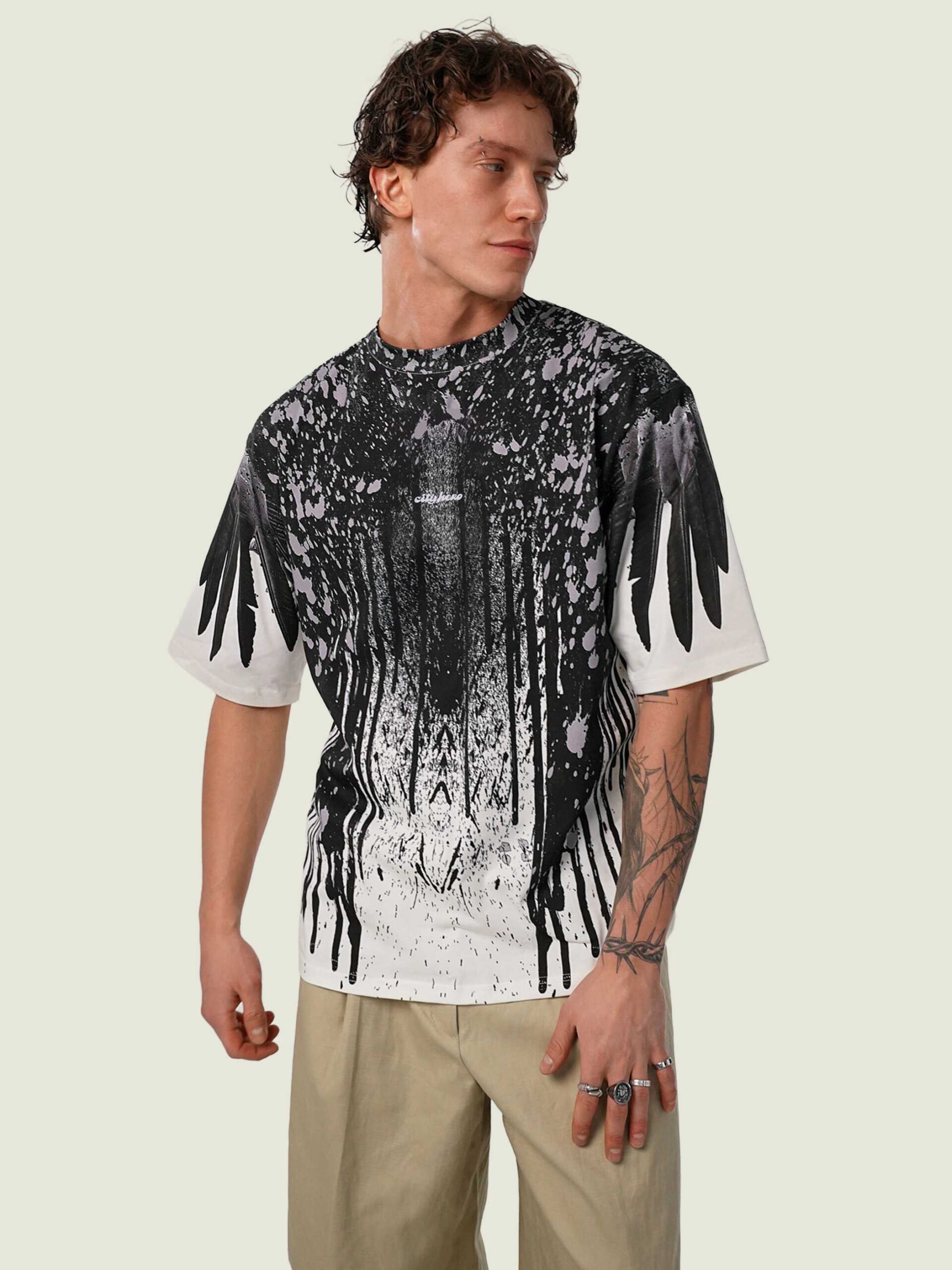 Футболка второго поколения в стиле интеллиджент оверсайз в черных тонах на белом фоне с принтом в виде гранжевых черных крыльев, опоясывающих верхнюю часть изделия.