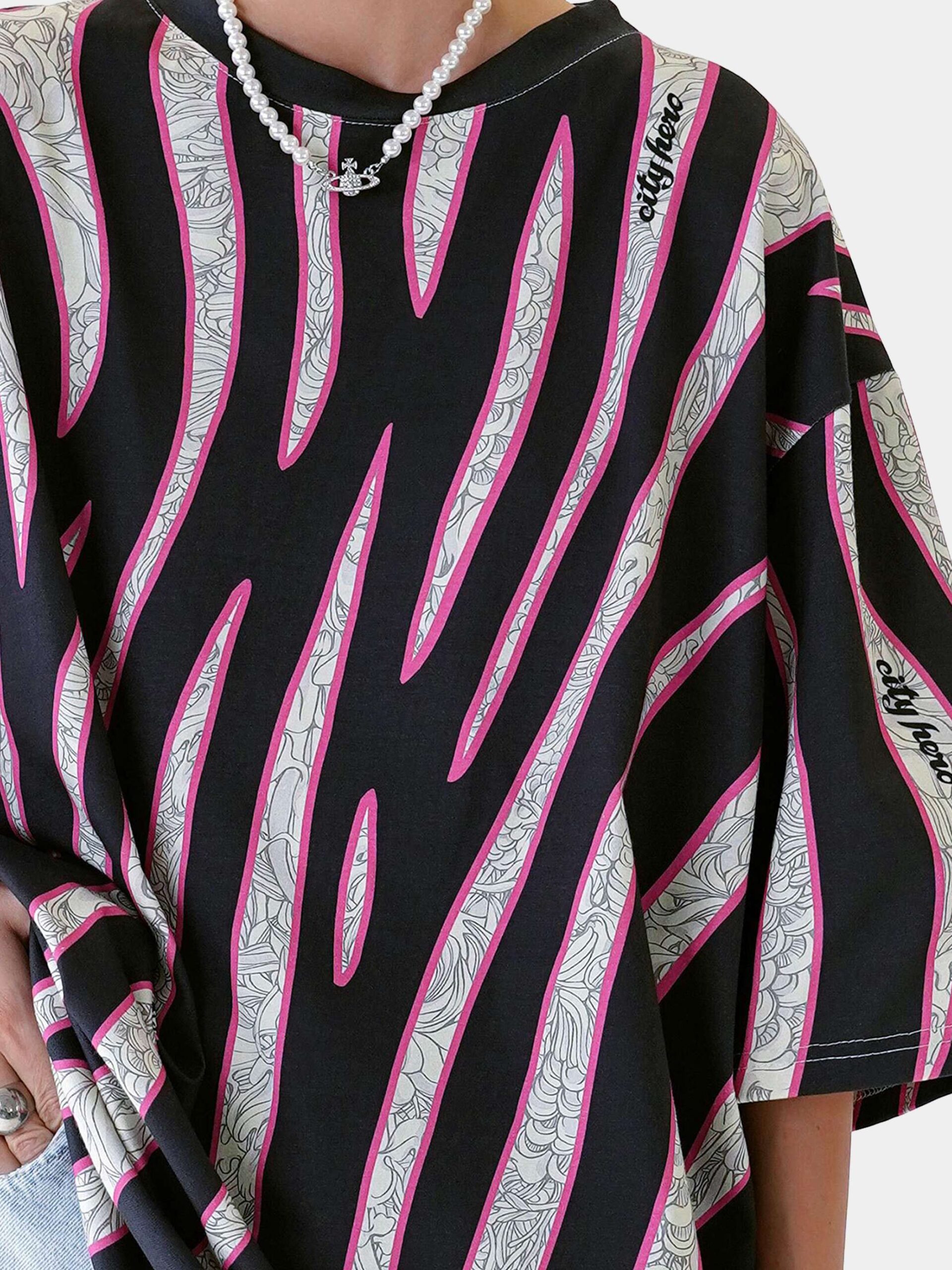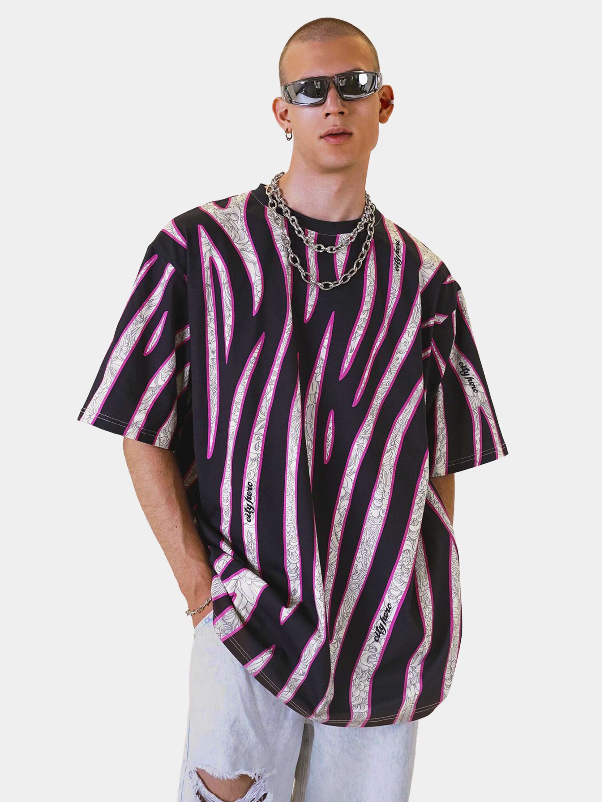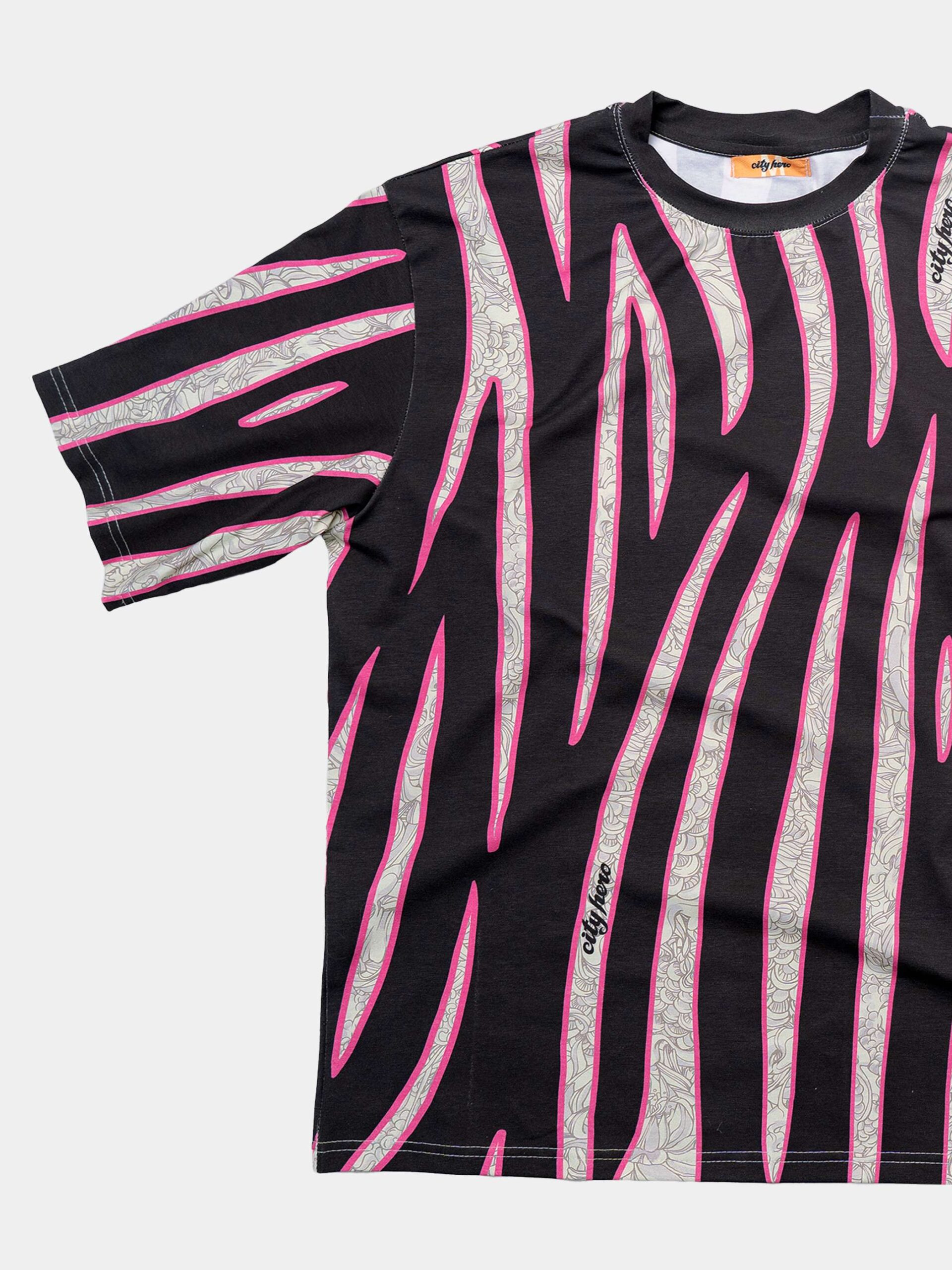 Футболка второго поколения в стиле интеллиджент оверсайз со стилизованным анималистичным принтом Зебра. В полоски зебры особым образом замешан фирменный линейный принт, который по своей консистенции идеально усложняет анималистичный природный окрас зебры.