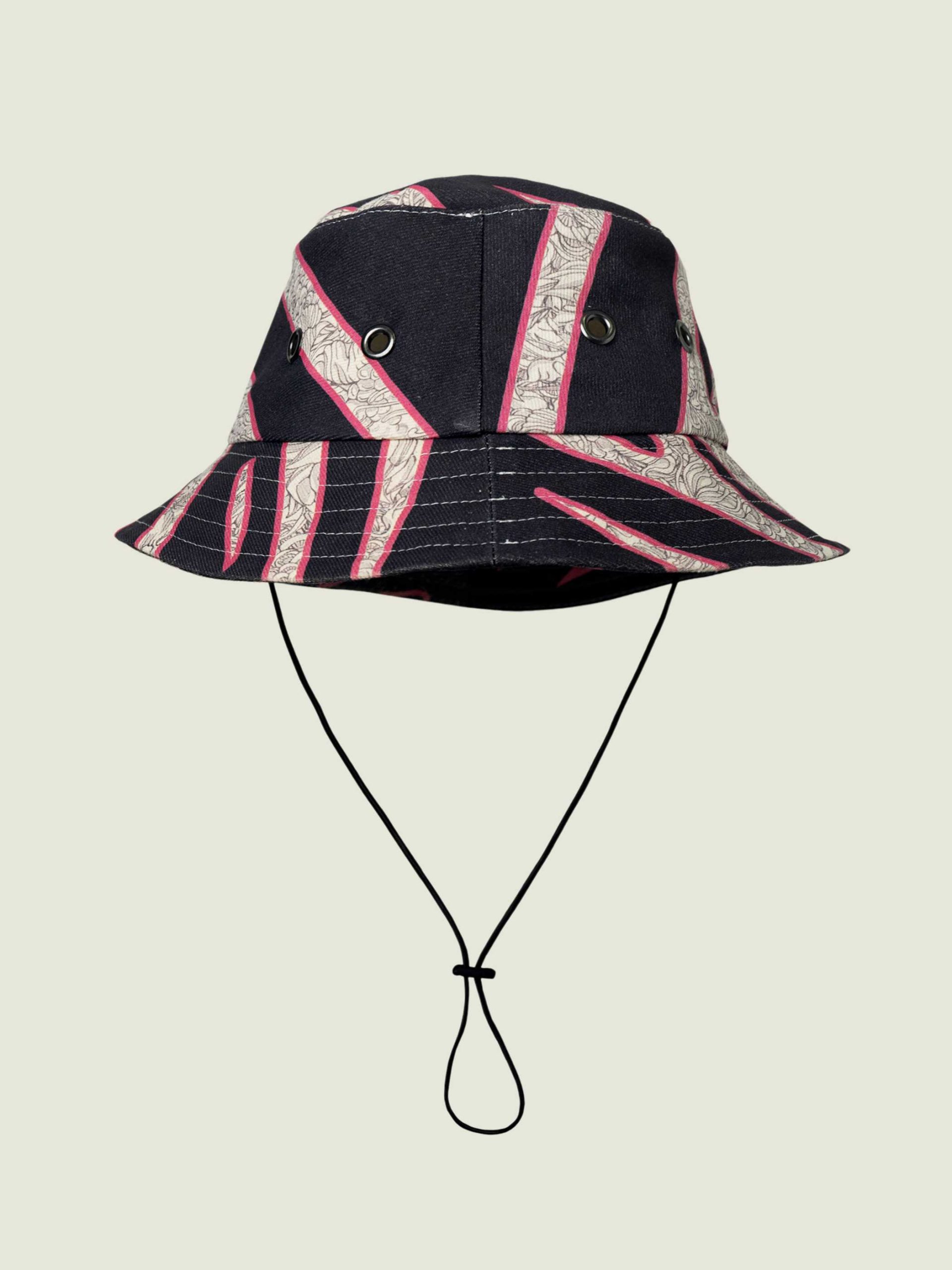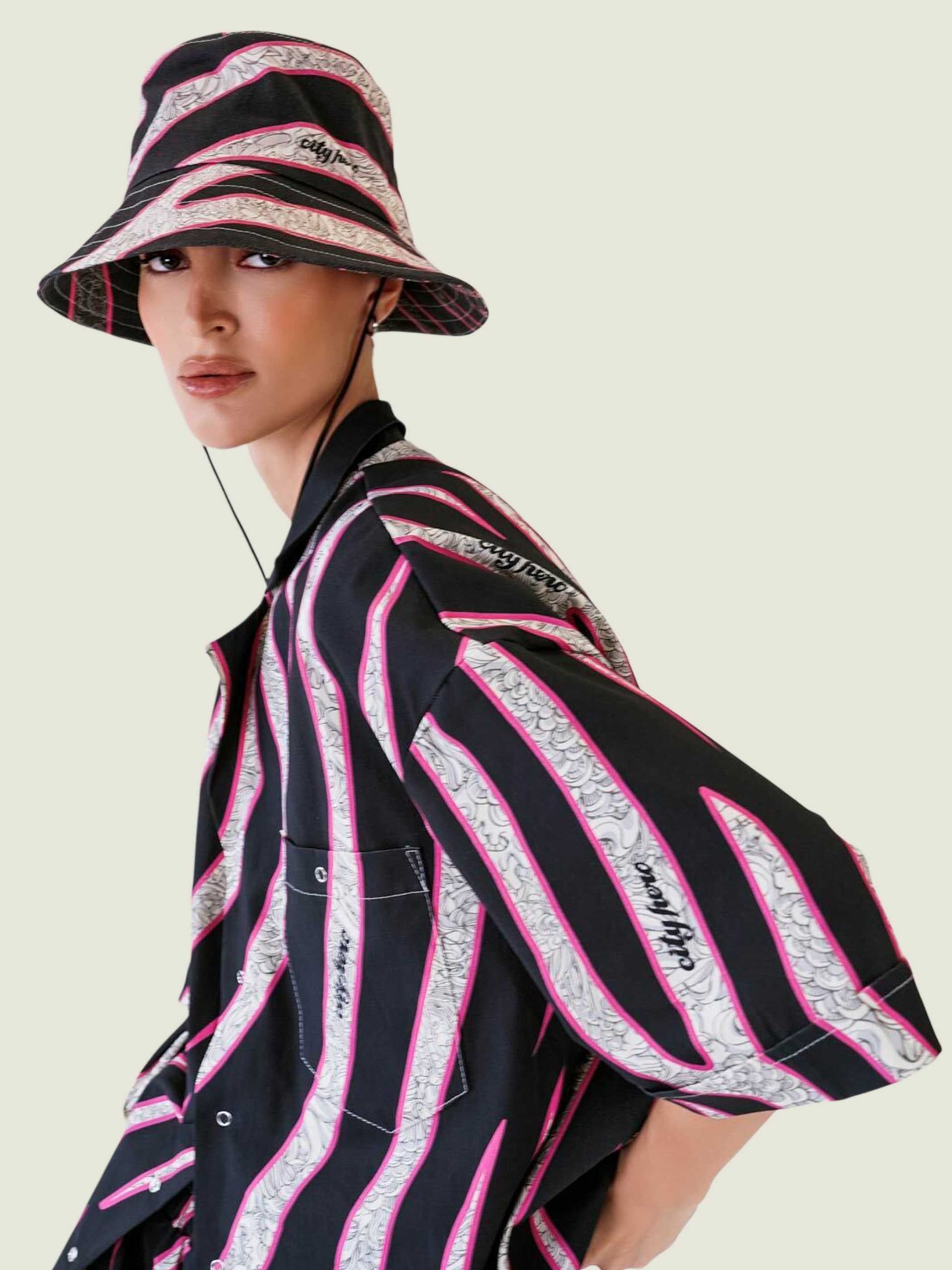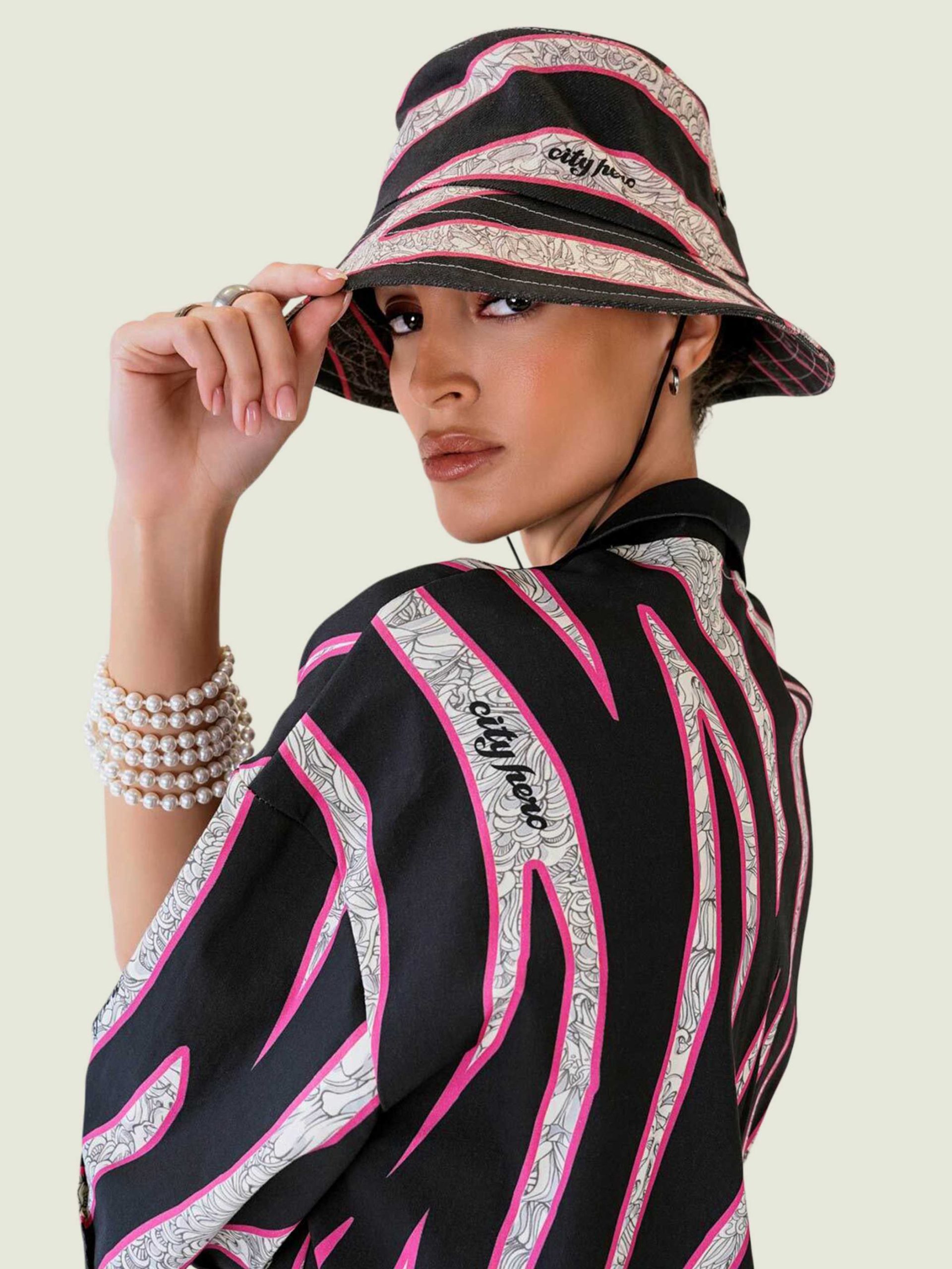 Панама со стилизованным анималистичным принтом Зебра. Выполнена из высококачественного канваса. Оснащена эластичным шнурком с ограничителем и вентиляционными люверсами.