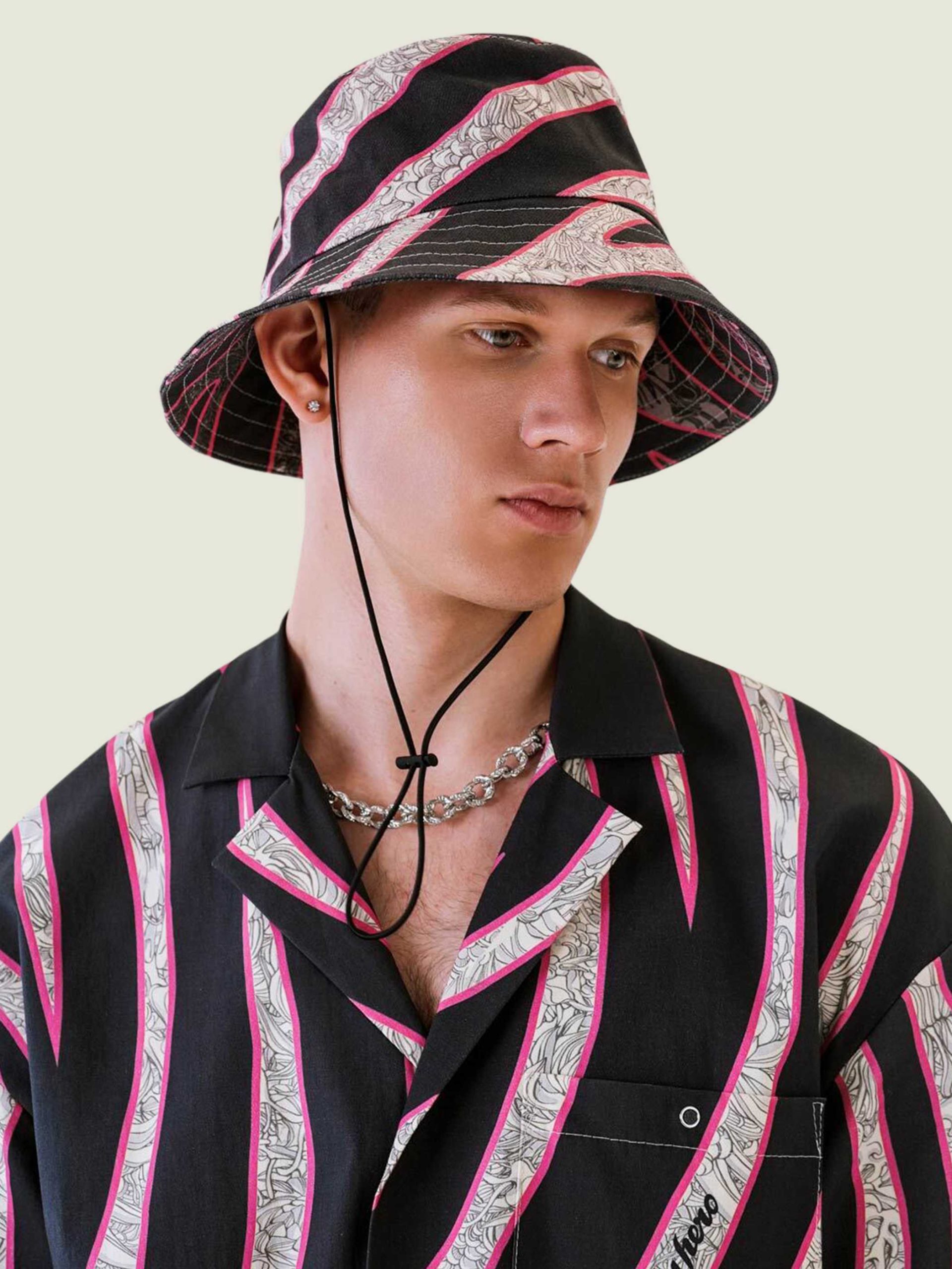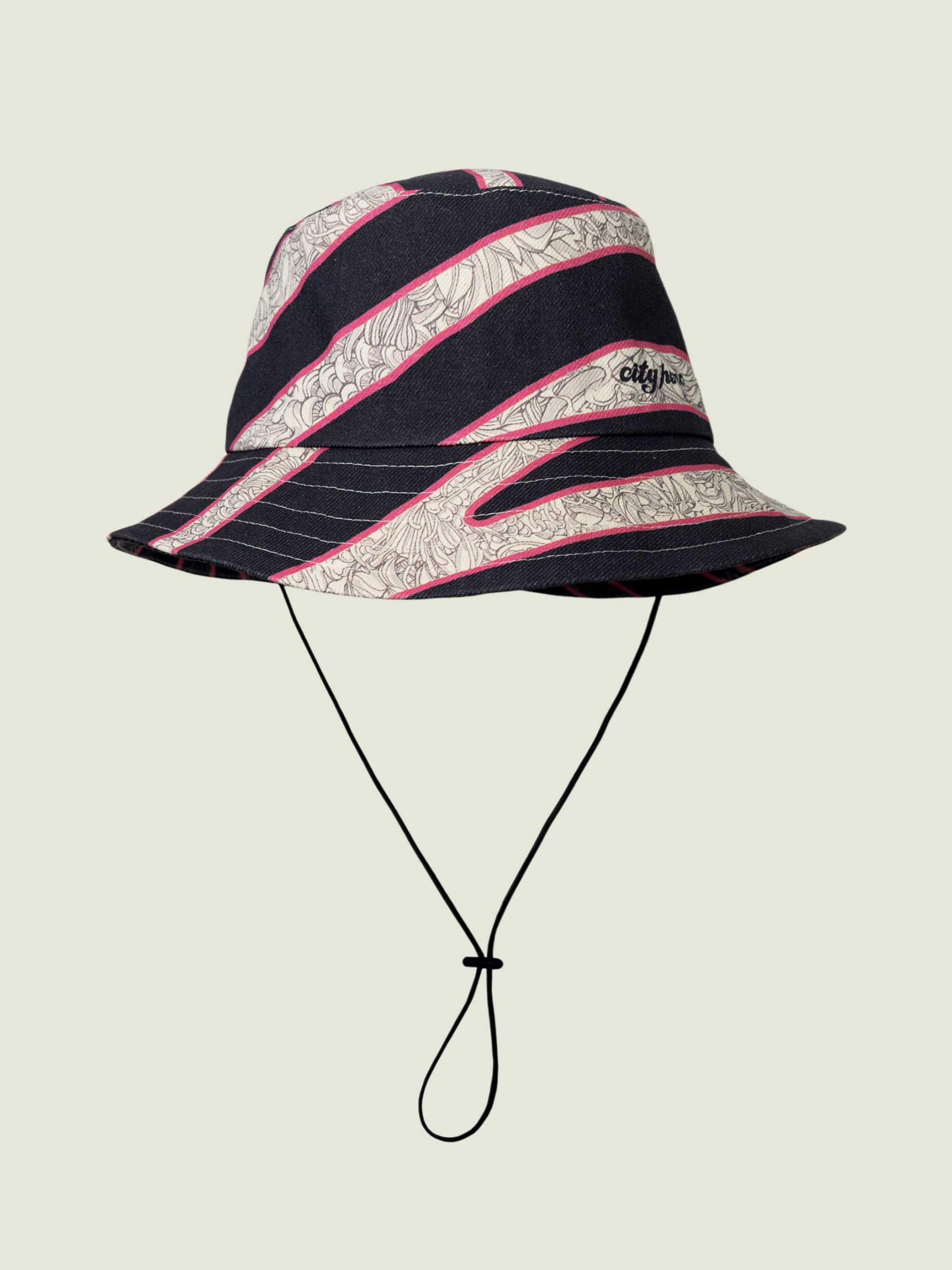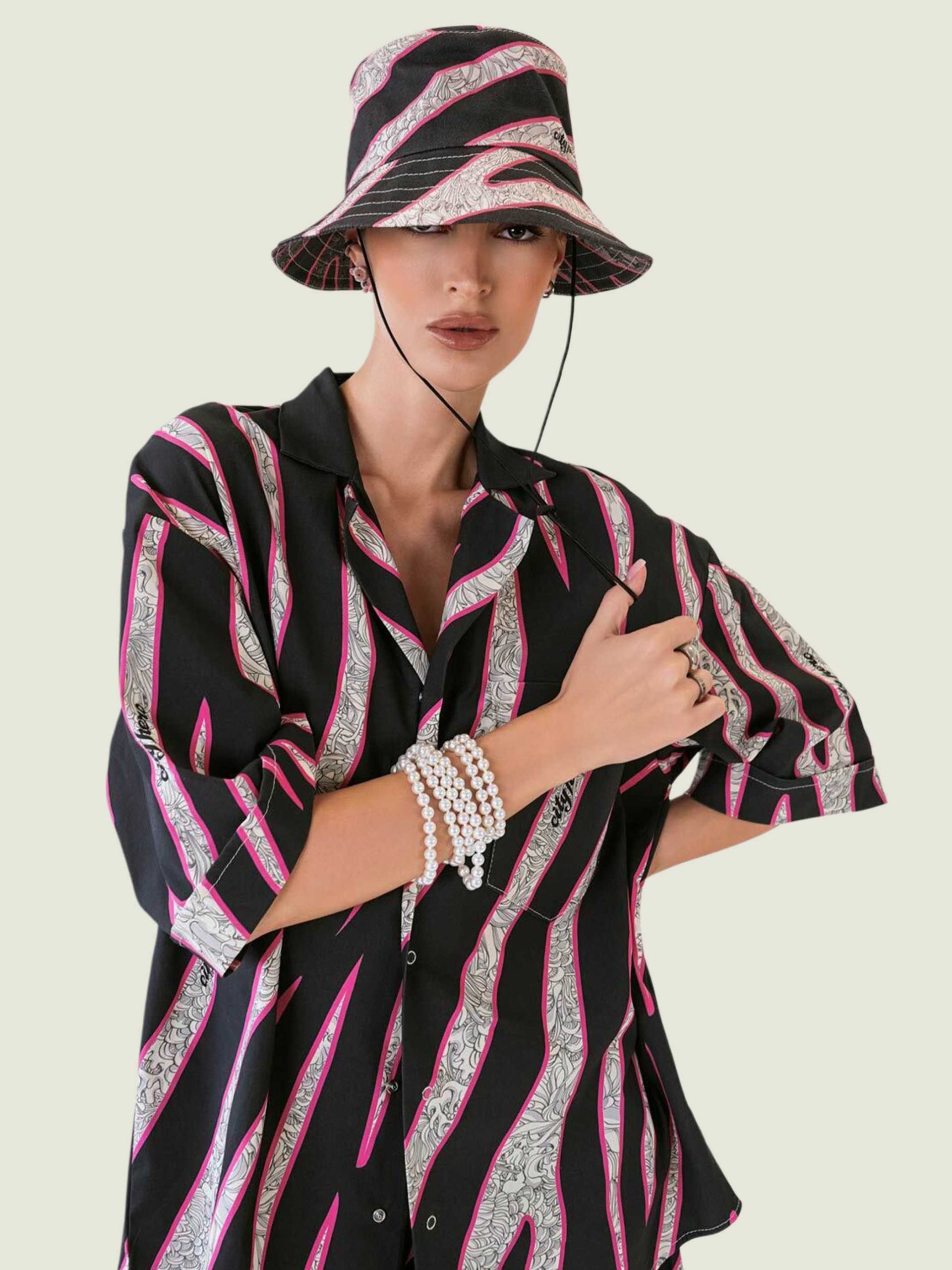 Панама со стилизованным анималистичным принтом Зебра. Выполнена из высококачественного канваса. Оснащена эластичным шнурком с ограничителем и вентиляционными люверсами.