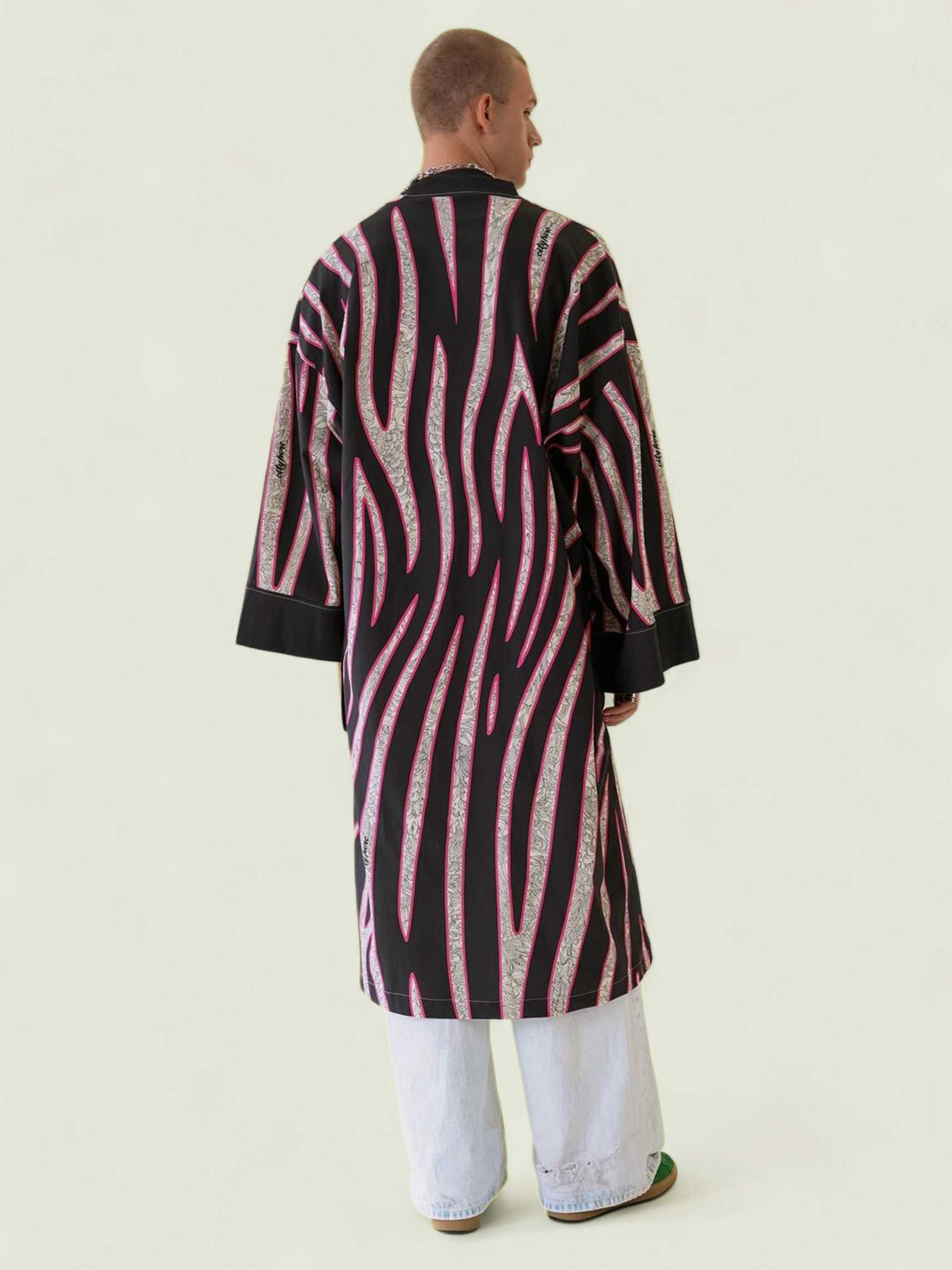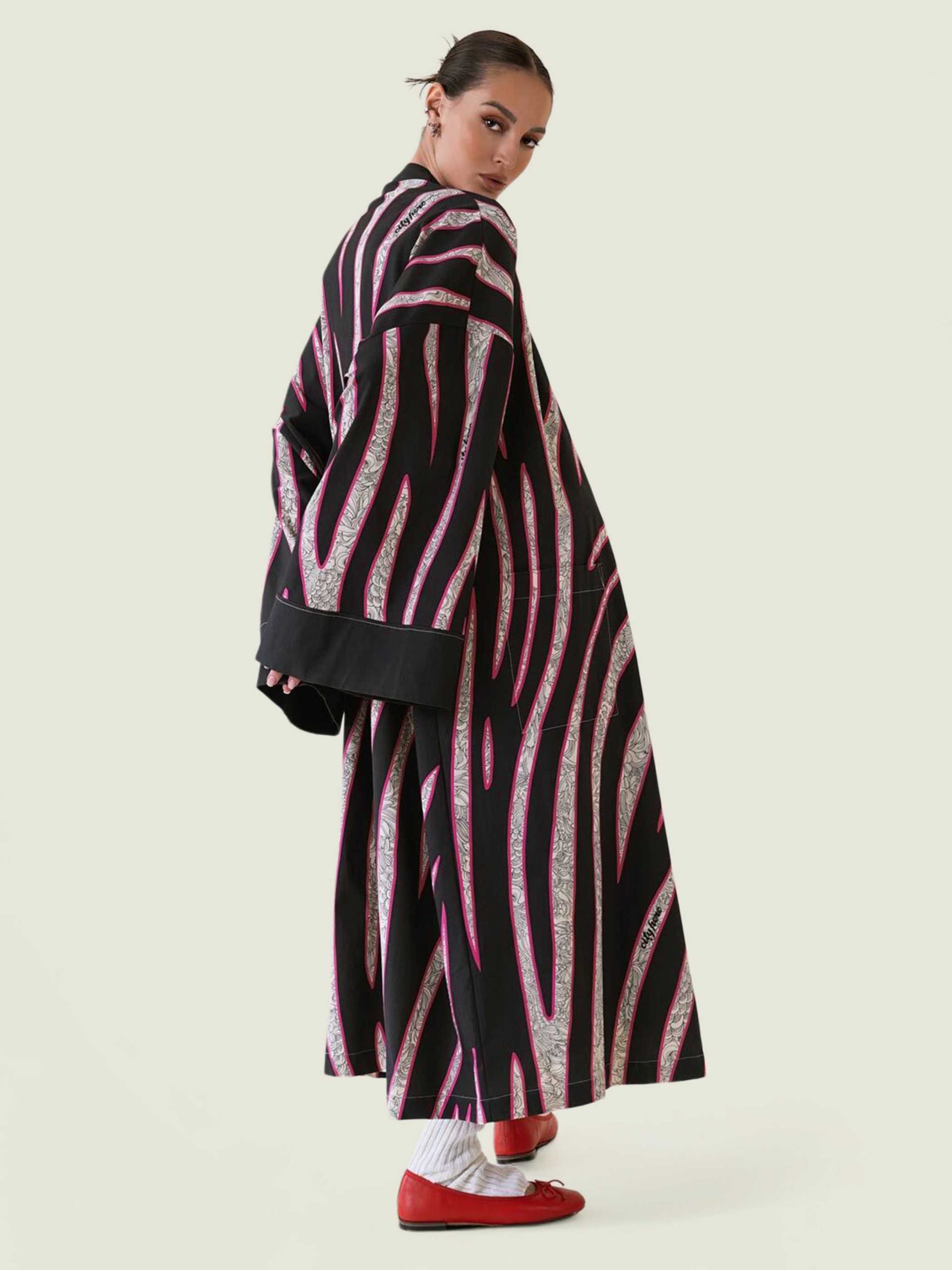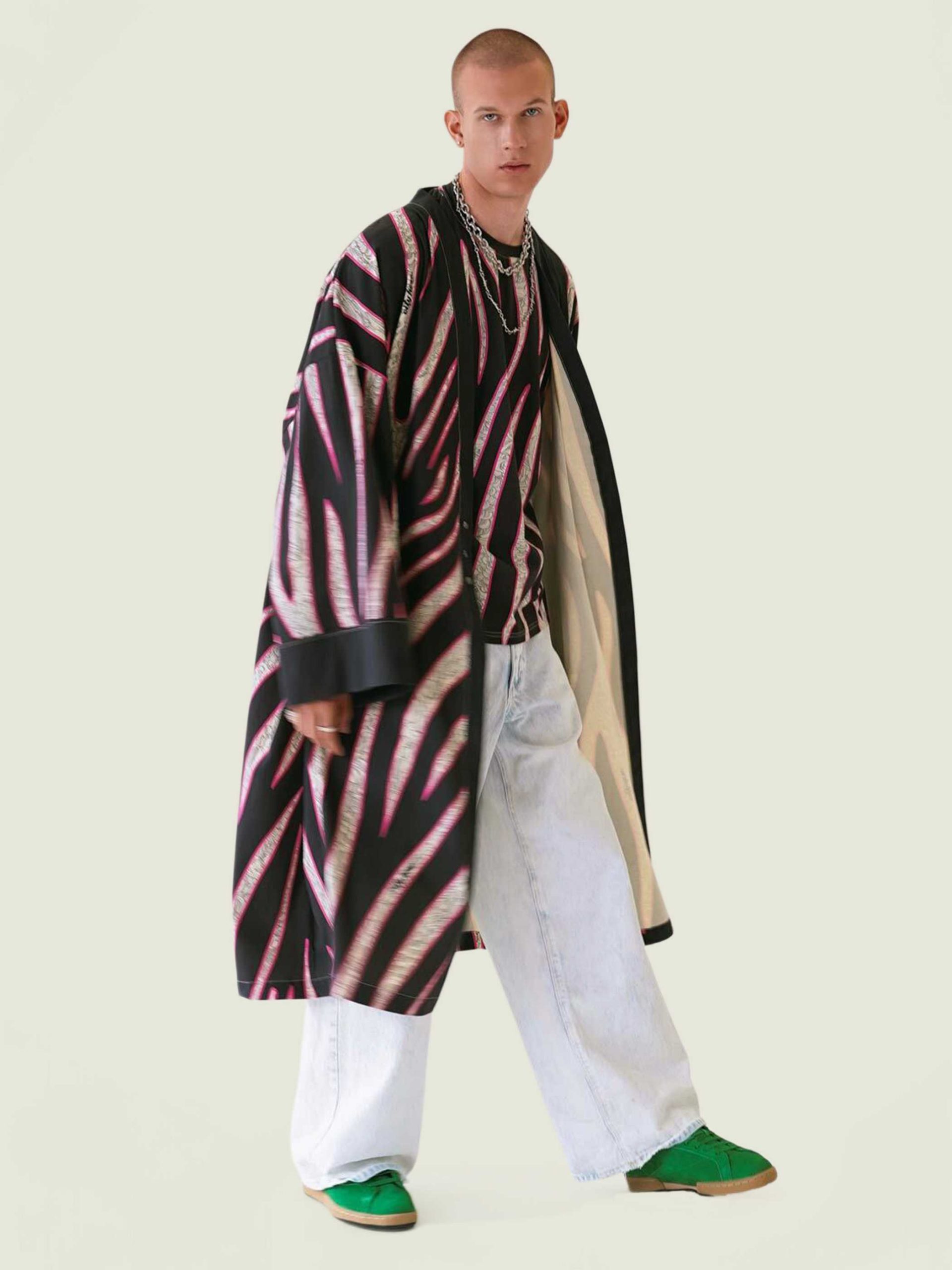 Уличный халат в стиле оверсайз со стилизованным анималистичным принтом Зебра. В полоски зебры особым образом замешан фирменный линейный принт, который по своей консистенции идеально усложняет анималистичный природный окрас зебры.