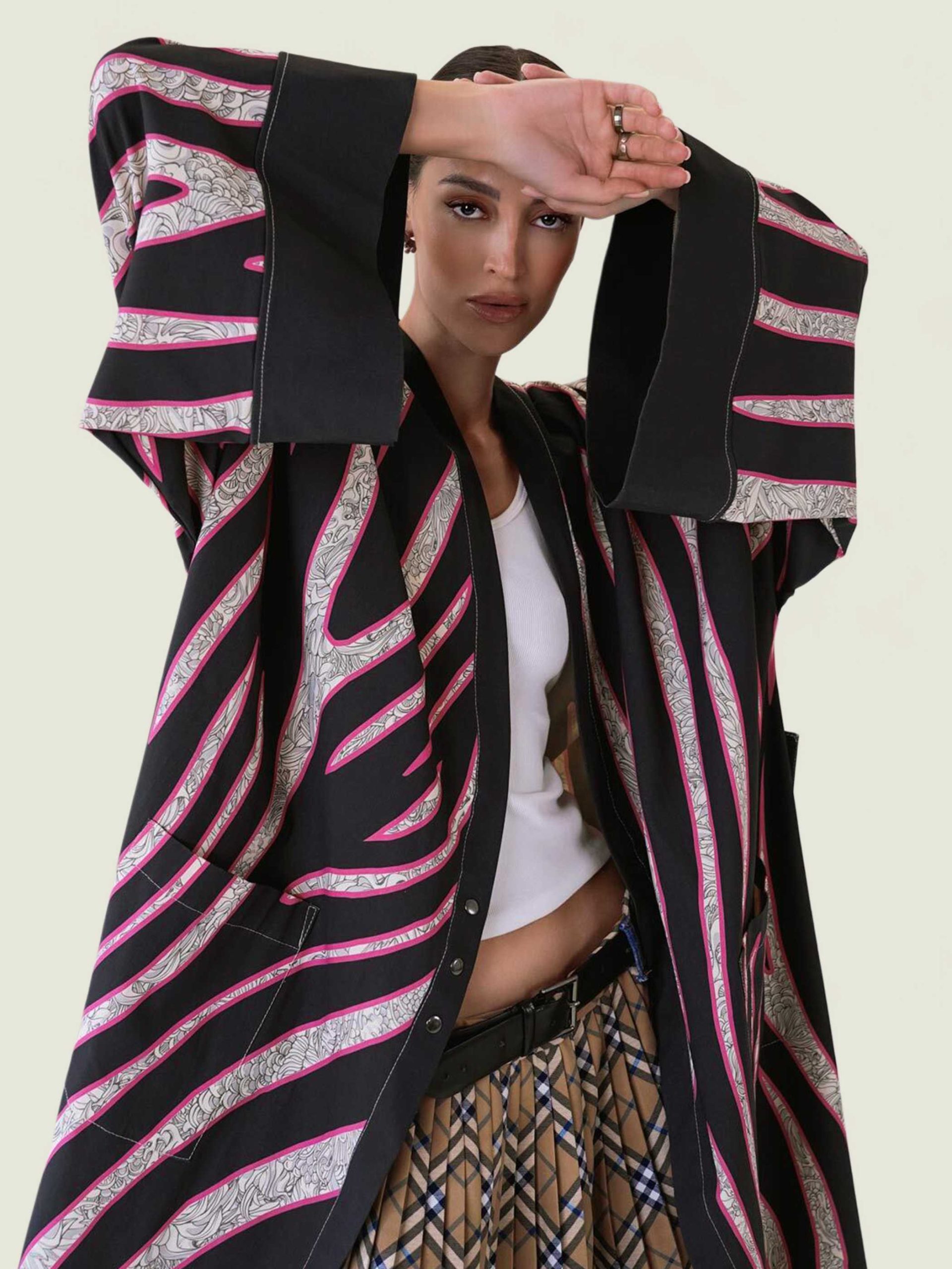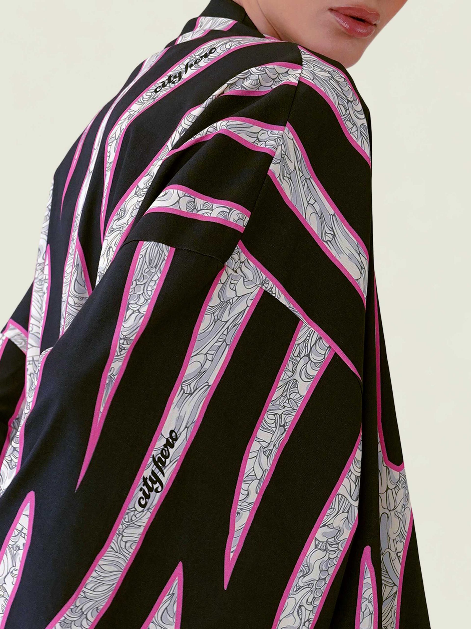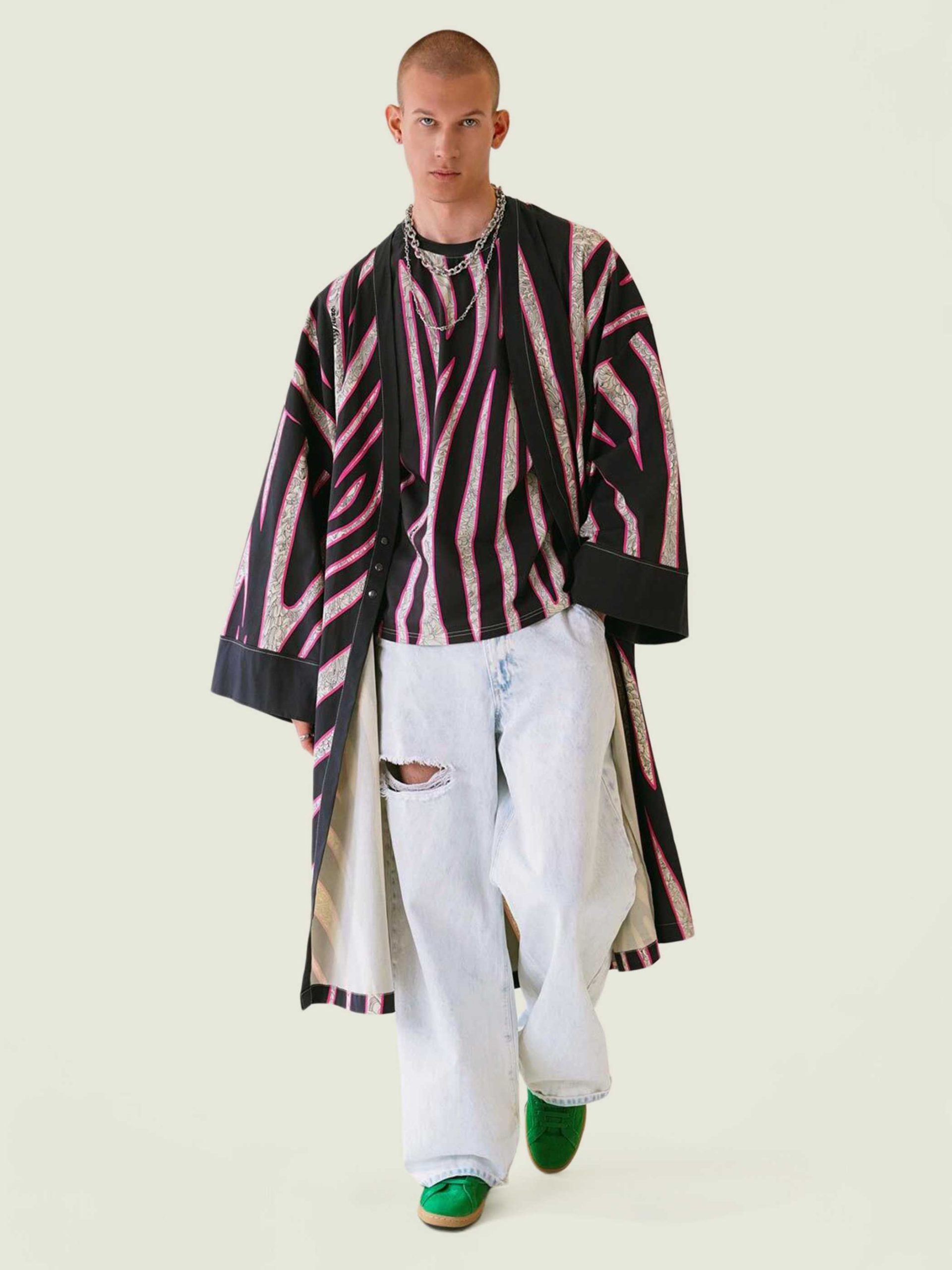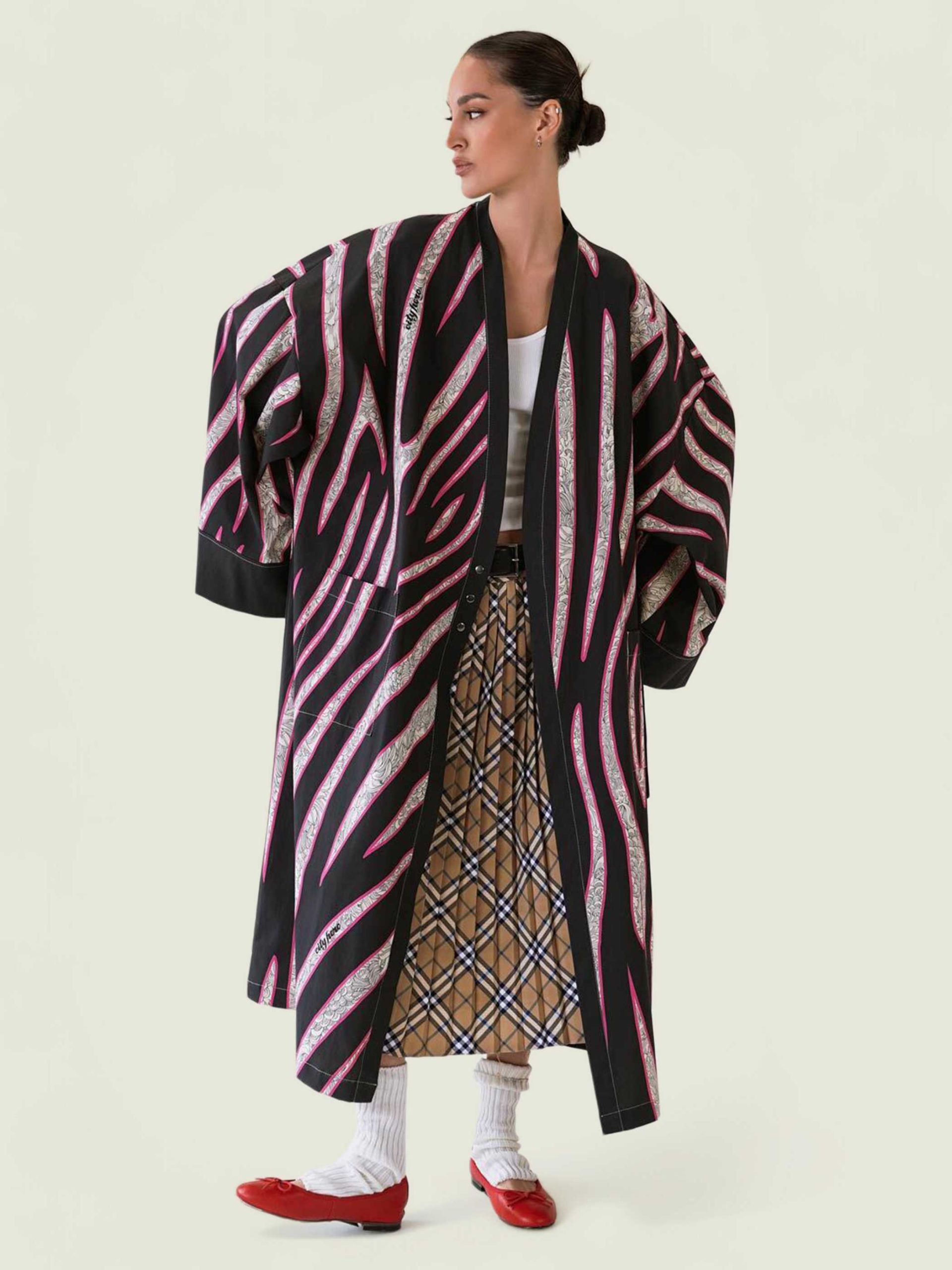 Уличный халат в стиле оверсайз со стилизованным анималистичным принтом Зебра. В полоски зебры особым образом замешан фирменный линейный принт, который по своей консистенции идеально усложняет анималистичный природный окрас зебры.