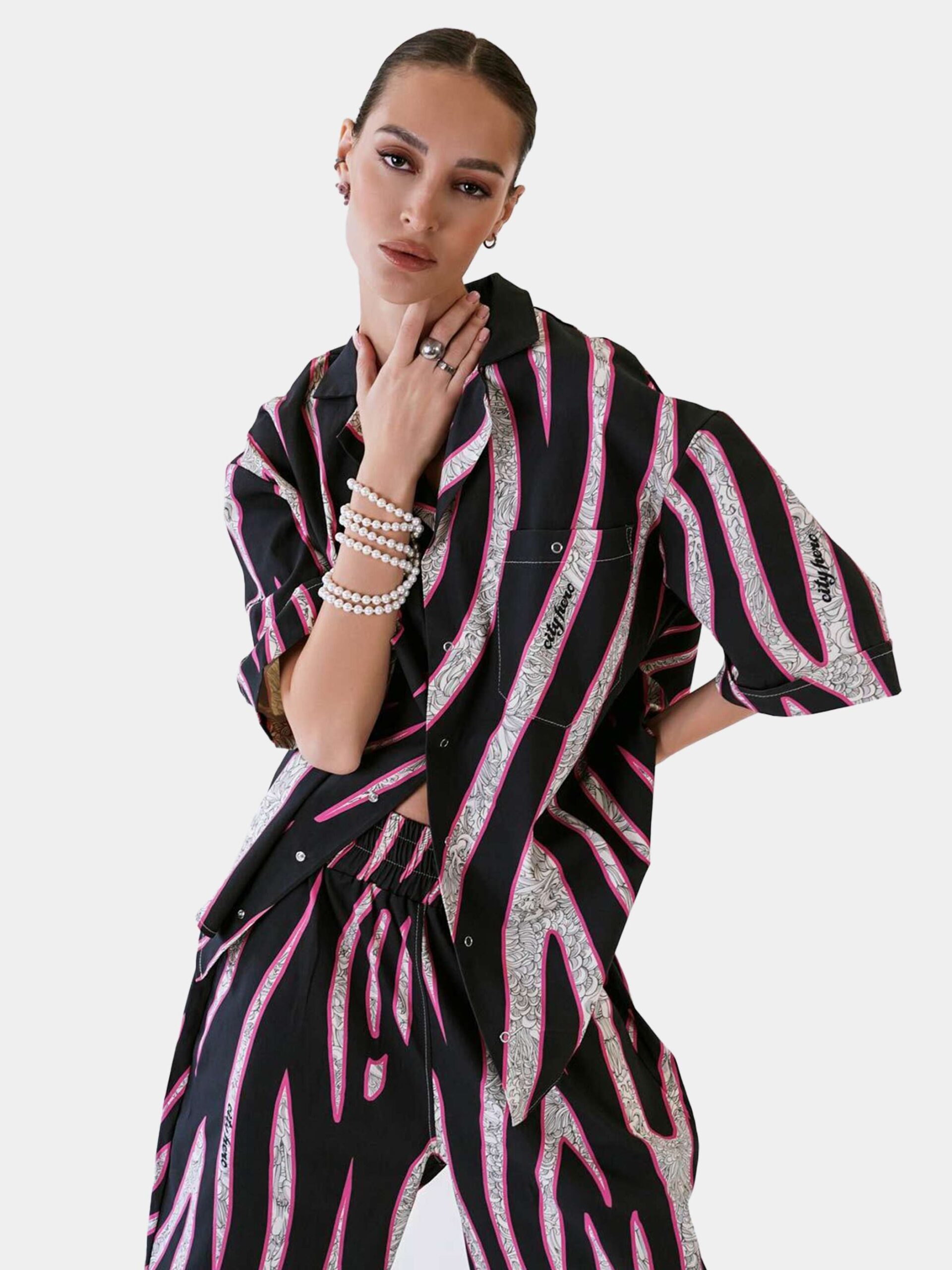 Уличная пижама с короткими рукавами и шортами в стиле оверсайз со стилизованным анималистичным принтом Зебра. В полоски зебры особым образом замешан фирменный линейный принт, который по своей консистенции идеально усложняет анималистичный природный окрас зебры.